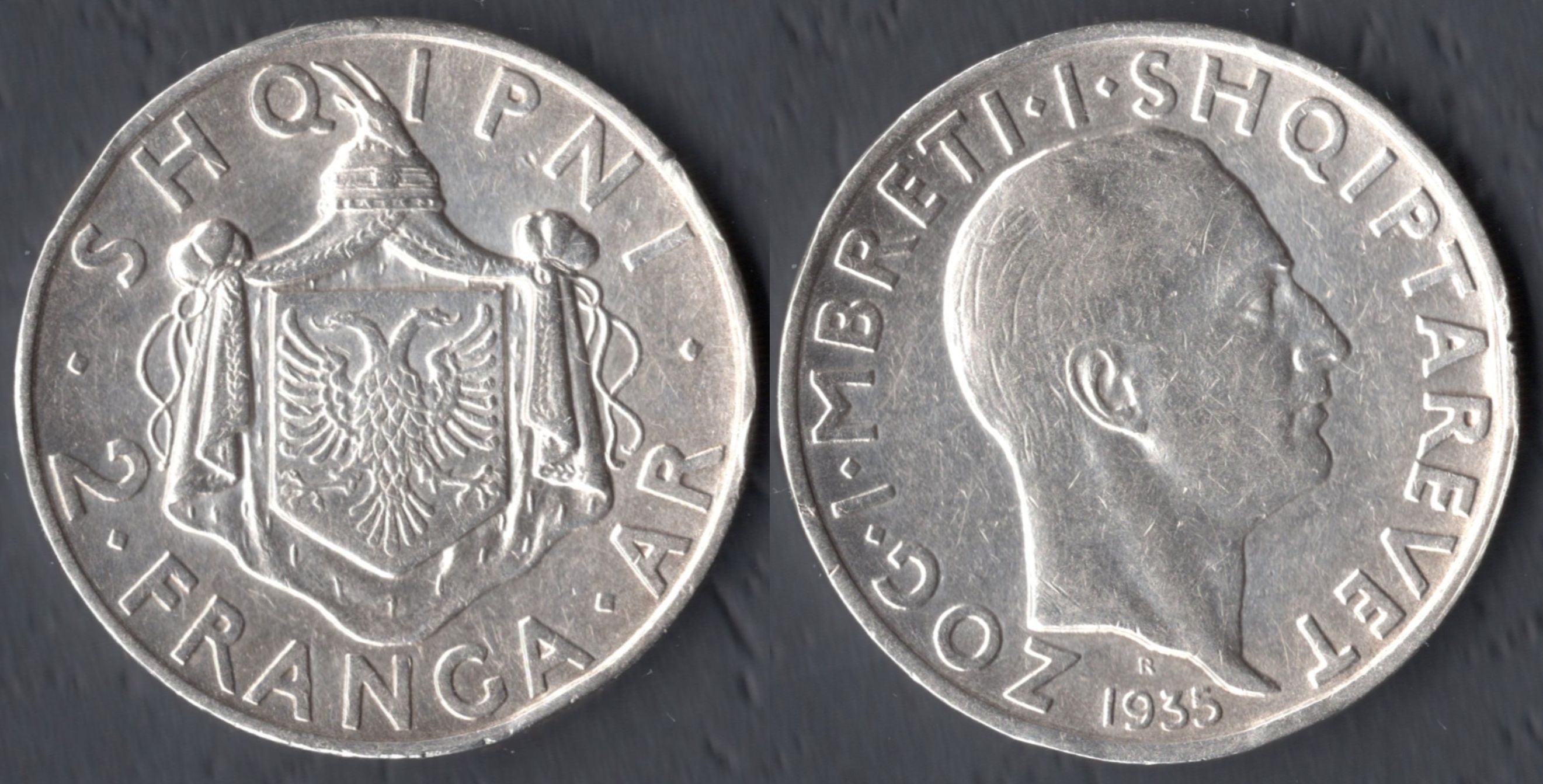В 1937 году Албанское Королевство по случаю 25 летней годовщины обретения независимости выпускает две юбилейные монеты достоинством в 1 и 2 франг ар.