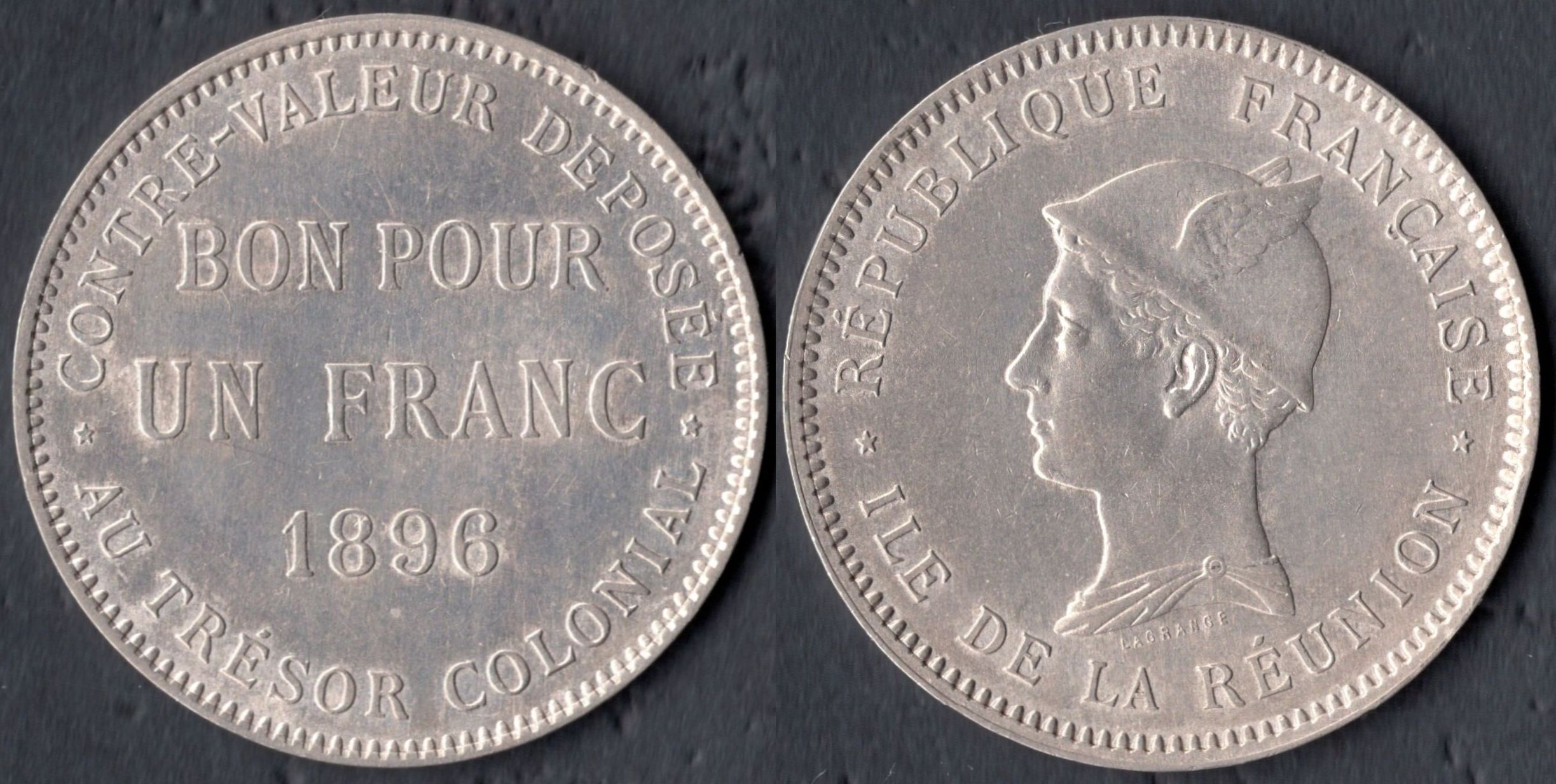 KM# 5, Французский Реюньон 1 франк 1896, медно-никелевый сплав, 500 тыс.экз., единственный год выпуска